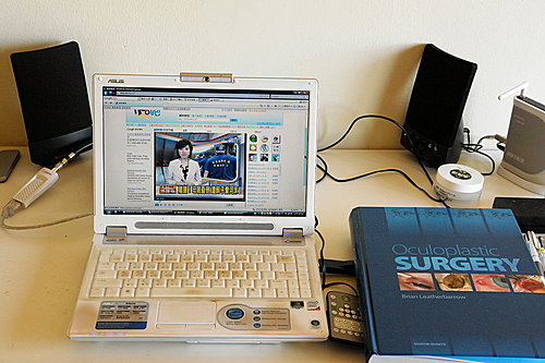 你看到了嗎?為了省些錢,當初在台灣就想到了,我買了電視棒(電腦左邊白白的那小根)。當然就可以把電腦當成電視來用了。這邊寬頻還滿快的,所以我就在網路上找到了適合的頻道。妳看,螢幕中在播台灣的新聞呢?別懷疑,是同步的歐! 另外我無聊也會看看這邊的節目,不過看不太習慣就是了