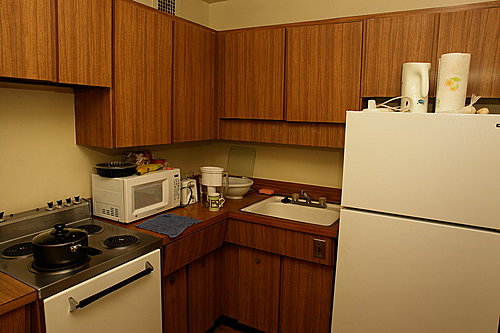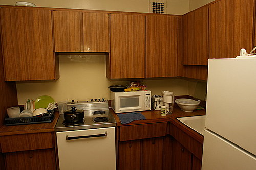 以上兩張就是我的廚房特寫,看起來挺不錯的吧! 我大份在這邊都自己煮,因為一來吃不慣老美的食物,二來怕胖,所以廚房幾乎都是我每天要用的。看到那個單柄鍋了吧!那可是我的萬用鍋歐,煎煮炒炸,都用它呢 。單柄鍋的下面就是這邊用的電爐,上面的四個鈕可以調整強度,下面一個像蚊香的不鏽鋼東西就是了,加熱的時候,那個不銹鋼條會變紅色的。老媽,這樣清楚了吧!