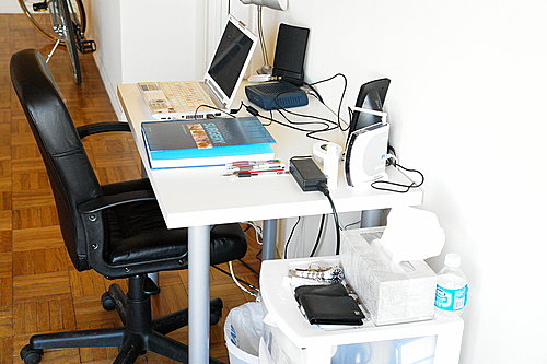 來張特寫,看清楚了嗎?右邊有個三層櫃,桌上則放有電腦,喇叭。這書桌跟椅子都是在IKEA買的,呵!
