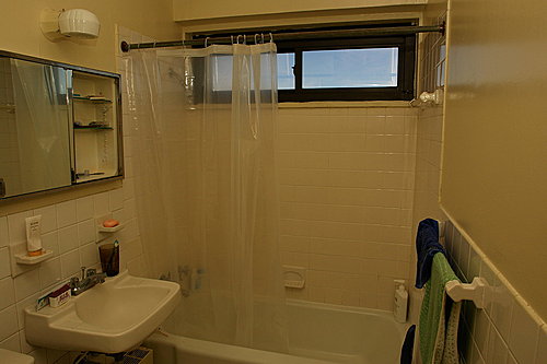 最後一張是小弟的浴室,呵呵!那個透明的浴簾看起來很性感吧。但主要的目的是為了擋水,因為他們的蓮蓬頭是固定在牆上的。那天去IKEA的時候有很多浴簾可以選,但這個透明的最便宜,於是就買了。挺不錯用的歐!